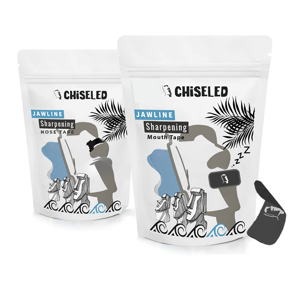 - Chiseled® Mouth Tape: A simple, skin-safe strip that gently seals the lips closed, steering airflow through the nose. By keeping the tongue resting against the palate and the jaw in its natural, forward position, it encourages subtle overnight muscle engagement for a cleaner, sharper jawline.